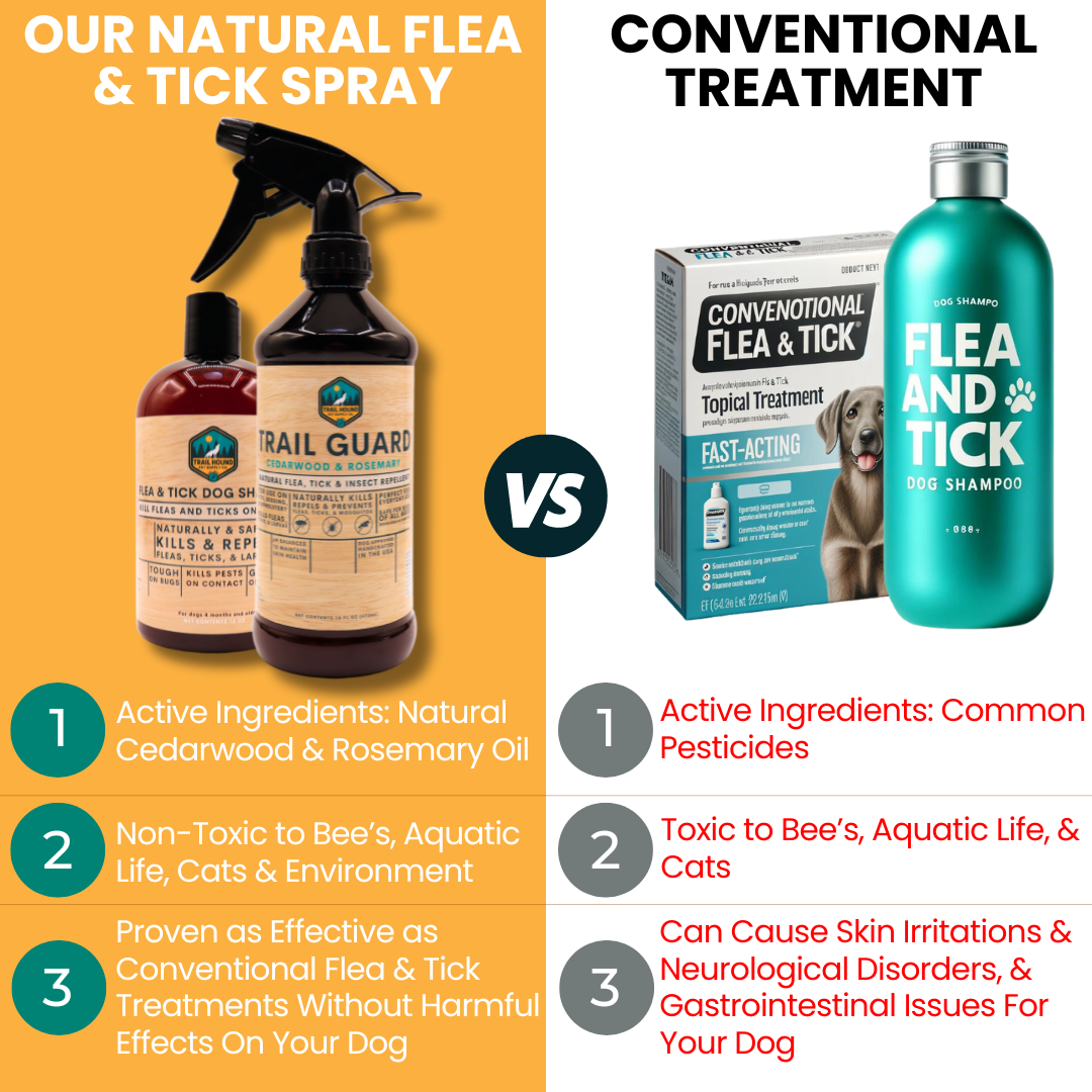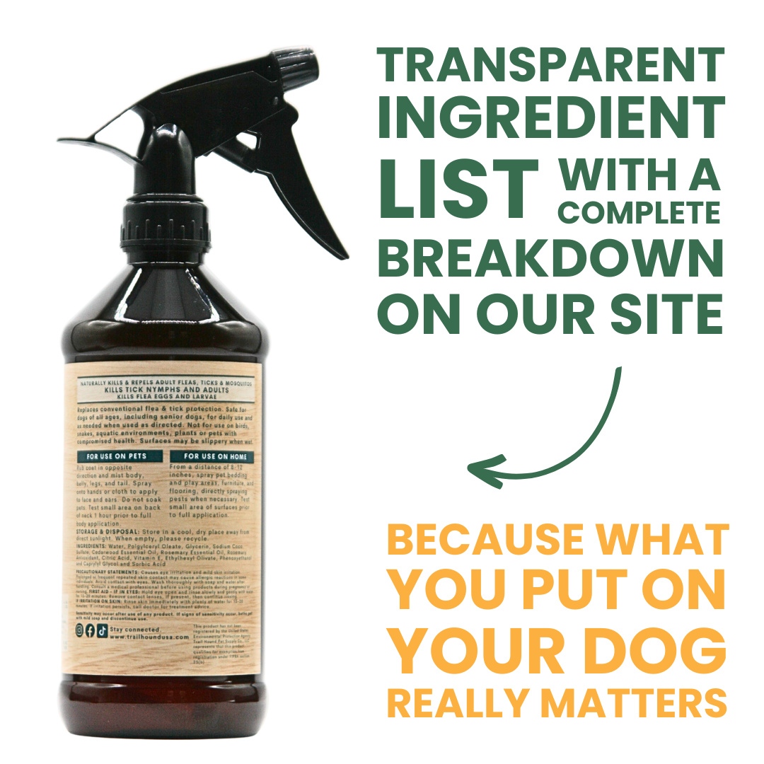 Trail Guard Spray & Our Flea & Tick Shampoo is formulated with premium natural ingredients that are carefully selected to provide the best care for your dog. We choose to use natural ingredients in our war against pets - Our Primary active ingredients are Cedarwood & Rosemary Oil. For a detailed ingredient list, please scroll back up to the ingredients section & click the Full Ingredients button for a full & transparent list of everything in Trail Guard & its purpose in the formula.