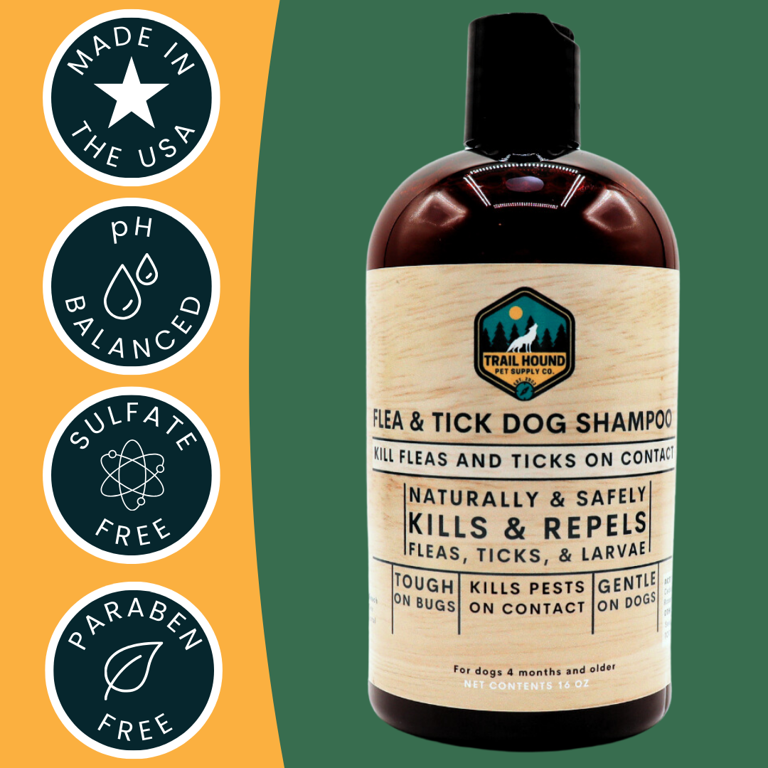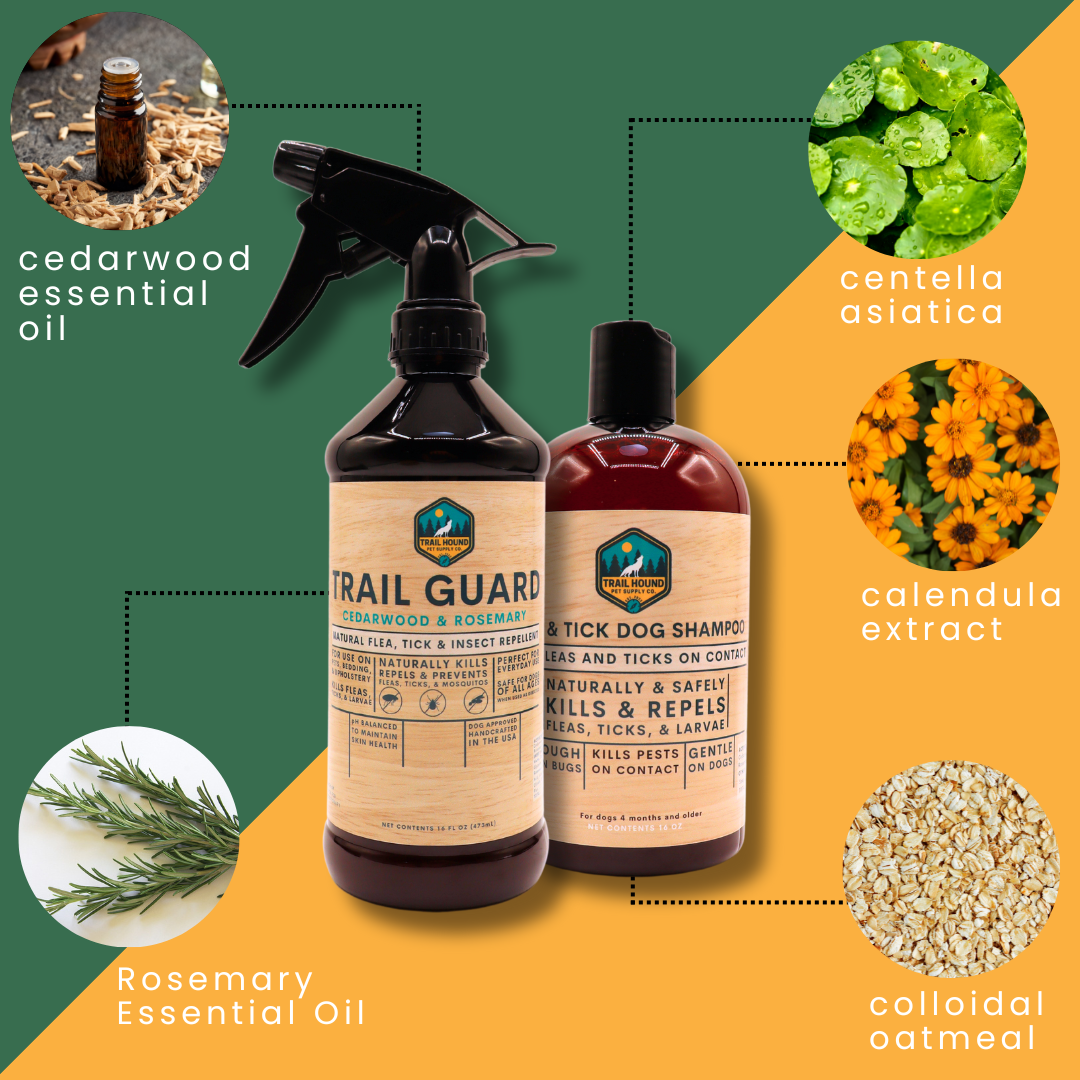 Dual-Action Defense: Equip Your Furry Friend With Our Trail Guard Flea & Tick Spray and New Flea and Tick Shampoo combo for Comprehensive, Natural Protection Against Pests.
