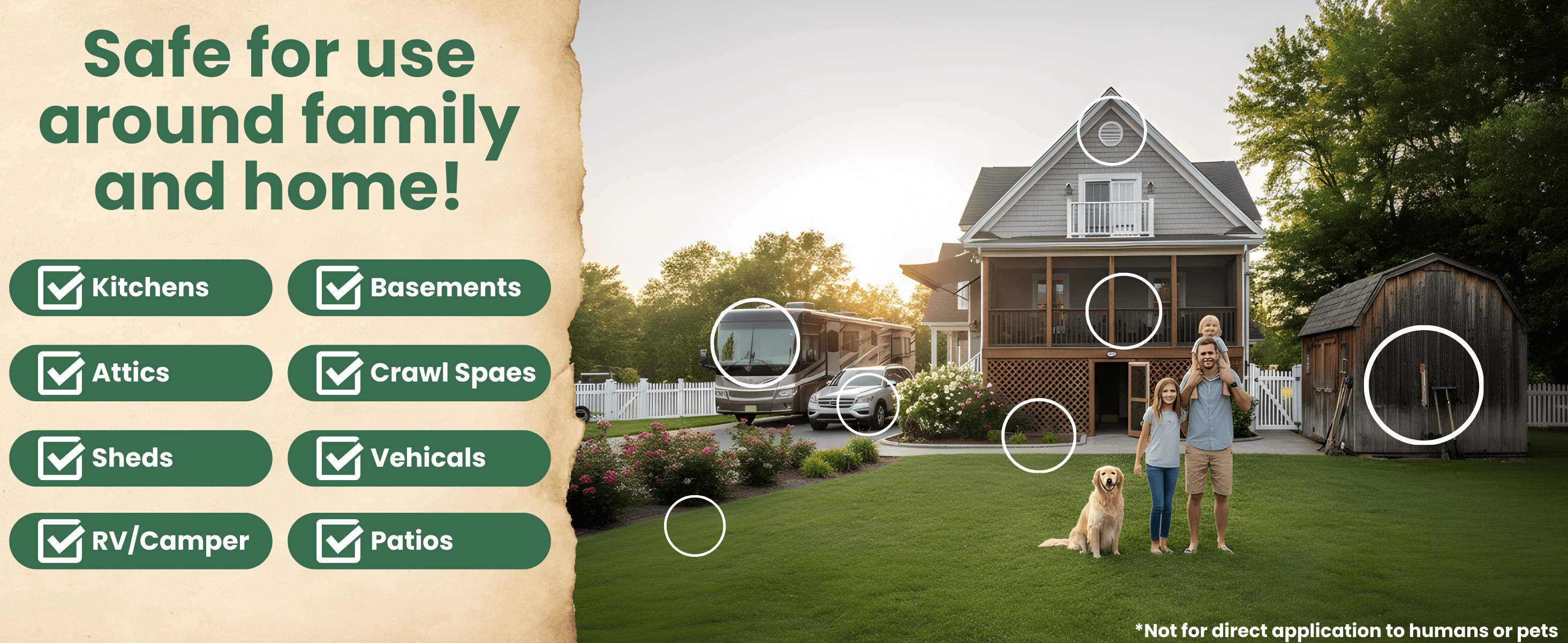 Yes – when used as directed, Rodent Guard is safe to use in homes with children and pets. Always spray onto surfaces (not directly on pets or people), and allow treated areas to dry fully before allowing contact. Avoid spraying on toys, bedding, or areas pets may lick.