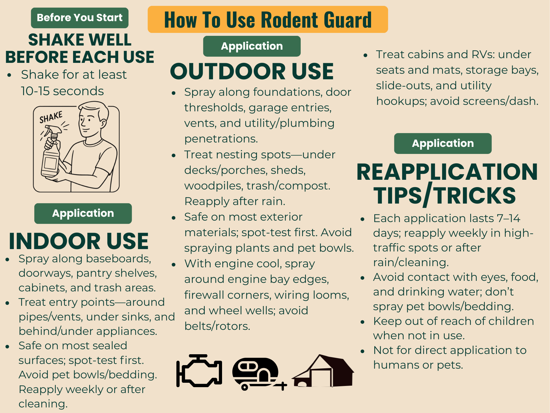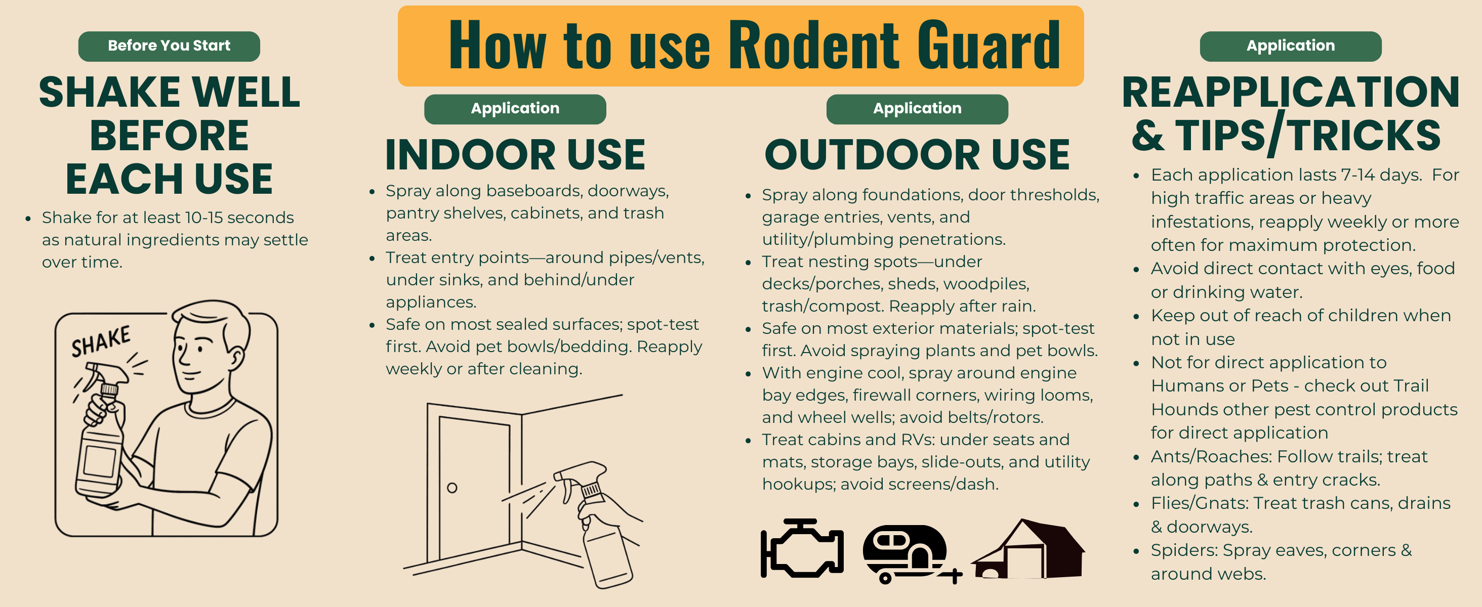 Rodent Guard is powered by natural essential oils, so it’s most effective for a few days up to one week per application. For active rodent issues or outdoor areas, we recommend reapplying every 3–7 days to maintain protection.